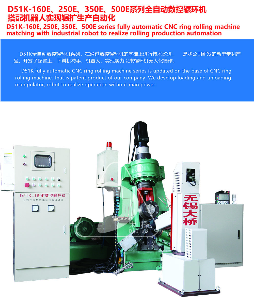 D51K全自動(dòng)數(shù)控輾環(huán)機(jī)系列,在通過數(shù)控輾環(huán)機(jī)的基礎(chǔ)上進(jìn)行技術(shù)改進(jìn),是我公司研發(fā)的專利產(chǎn)品。開發(fā)了配置上、下料機(jī)械手、機(jī)器人、實(shí)現(xiàn)輾環(huán)機(jī)無(wú)人化操作。